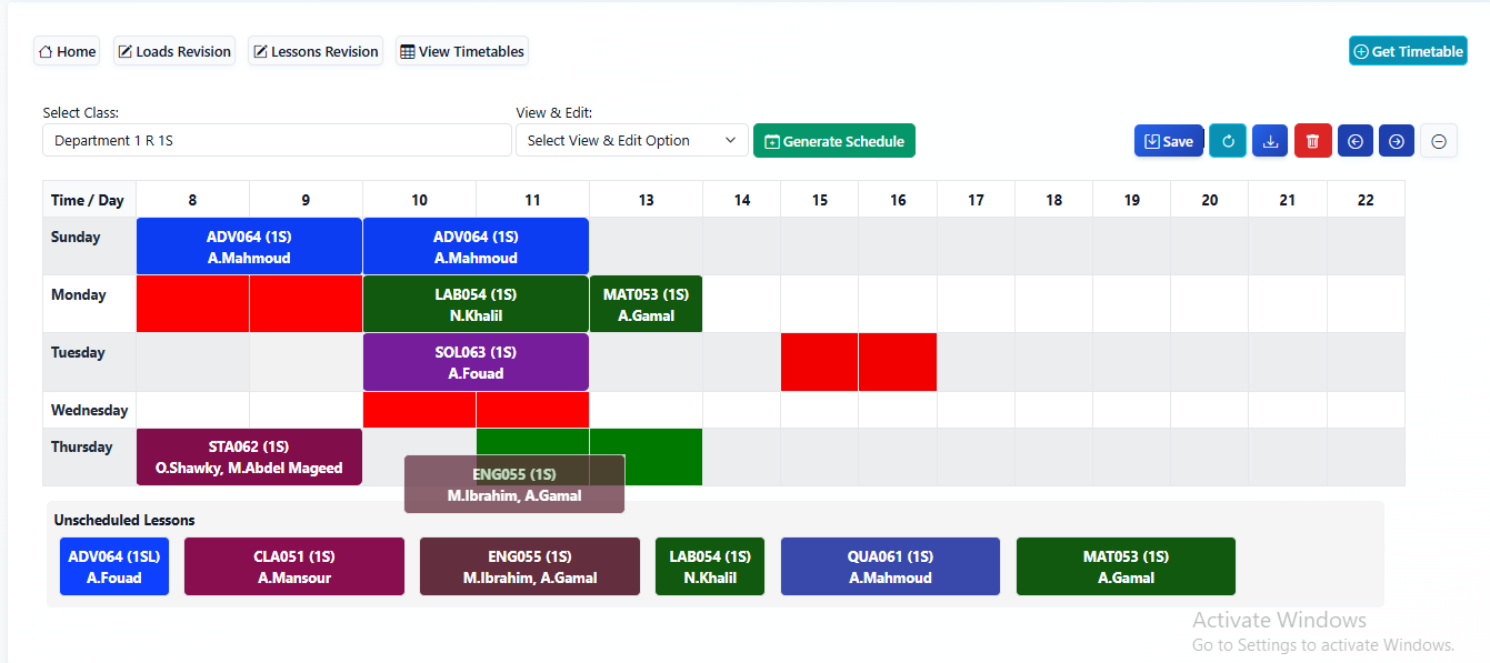 Automatically assigns classrooms by section and room capacity, and schedules instructors with minimal gaps between lessons.